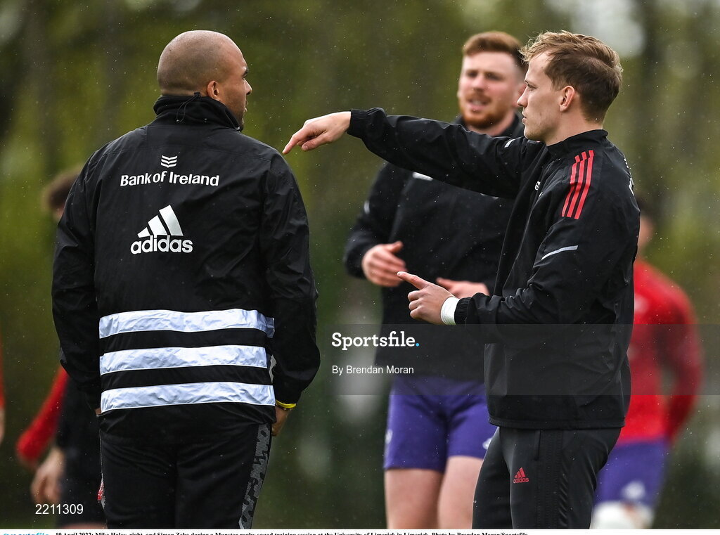 19 April 2022; Mike Haley, right, and Simon Zebo during a Munster rugby squad training session at the University of Limerick in Limerick. Photo by Brendan Moran/Sportsfile