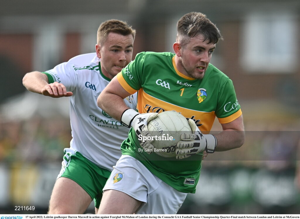17 April 2022; Leitrim goalkeeper Darren Maxwell in action against Fearghal McMahon of London during the Connacht GAA Football Senior Championship Quarter-Final match between London and Leitrim at McGovern Park in Ruislip, London, England. Photo by Sam Barnes/Sportsfile