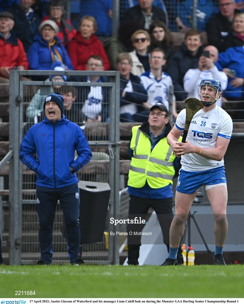17 April 2022; Austin Gleeson of Waterford and his manager Liam Cahill look on during the Munster GAA Hurling Senior Championship Round 1 match between Waterford and Tipperary at Walsh Park in Waterford. Photo by Piaras Ó Mídheach/Sportsfile
