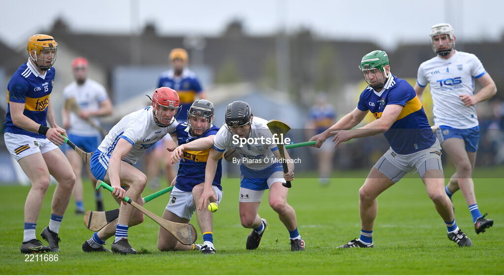 17 April 2022; Darragh Lyons of Waterford, supported by teammate Tadhg De Búrca, left, in action against Tipperary players, from left, Jake Morris, Alan Flynn, and Noel McGrath during the Munster GAA Hurling Senior Championship Round 1 match between Waterford and Tipperary at Walsh Park in Waterford. Photo by Piaras Ó Mídheach/Sportsfile