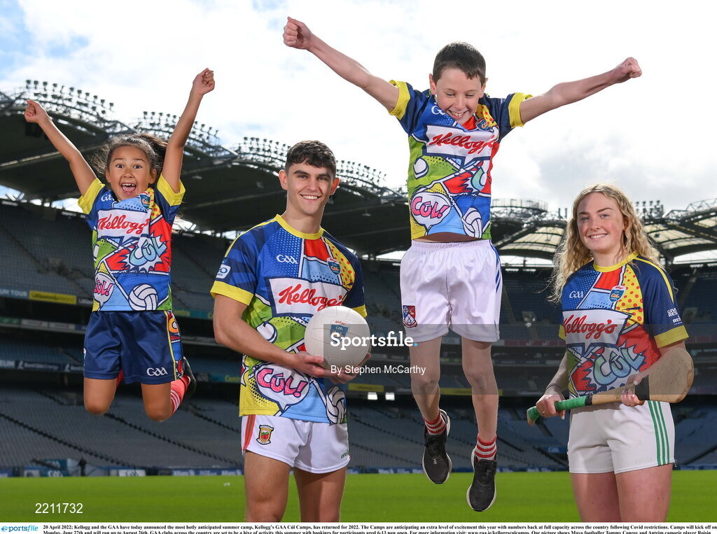 20 April 2022; Kellogg and the GAA have today announced the most hotly anticipated summer camp, Kellogg’s GAA Cúl Camps, has returned for 2022. The Camps are anticipating an extra level of excitement this year with numbers back at full capacity across the country following Covid restrictions. Camps will kick off on Monday, June 27th and will run up to August 26th. GAA clubs across the country are set to be a hive of activity this summer with bookings for participants aged 6-13 now open. For more information visit: www.gaa.ie/kelloggsculcamps. Our picture shows Mayo footballer Tommy Conroy and Antrim camogie player Roisin McCormick with Portia McLaughlin, age 7, from Dublin, and Donnacha Lally, age 11 from Ahascragh-Fohenagh GAA, Galway, during the Launch of the 2022 Kellogg’s GAA Cúl Camps at Croke Park in Dublin. Photo by Stephen McCarthy/Sportsfile