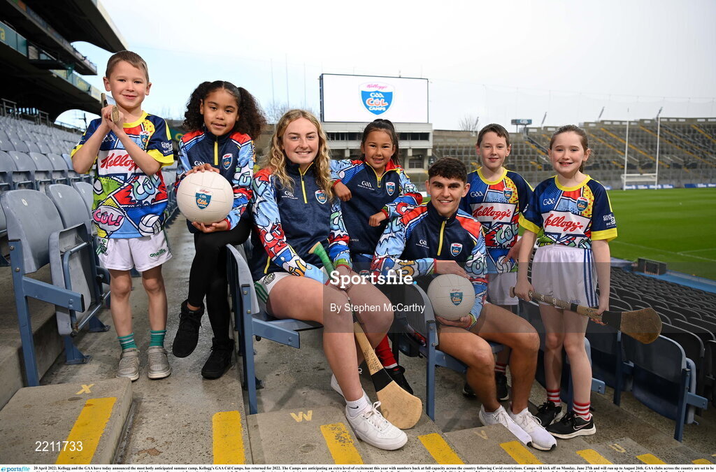 20 April 2022; Kellogg and the GAA have today announced the most hotly anticipated summer camp, Kellogg’s GAA Cúl Camps, has returned for 2022. The Camps are anticipating an extra level of excitement this year with numbers back at full capacity across the country following Covid restrictions. Camps will kick off on Monday, June 27th and will run up to August 26th. GAA clubs across the country are set to be a hive of activity this summer with bookings for participants aged 6-13 now open. For more information visit: www.gaa.ie/kelloggsculcamps. Our picture shows Antrim camogie player Roisin McCormick and Mayo footballer Tommy Conroy with, from left, Oisín Lally, age 7 from Caltra GAA, Galway, Emeli Doyle, age 8, from Dublin, Portia McLaughlin, age 7, from Dublin, Donnacha Lally, age 11 from Ahascragh-Fohenagh GAA, Galway, and Éabha Lally, age 9, from Ahascragh-Caltra GAA, Galway, during the Launch of the 2022 Kellogg’s GAA Cúl Camps at Croke Park in Dublin. Photo by Stephen McCarthy/Sportsfile