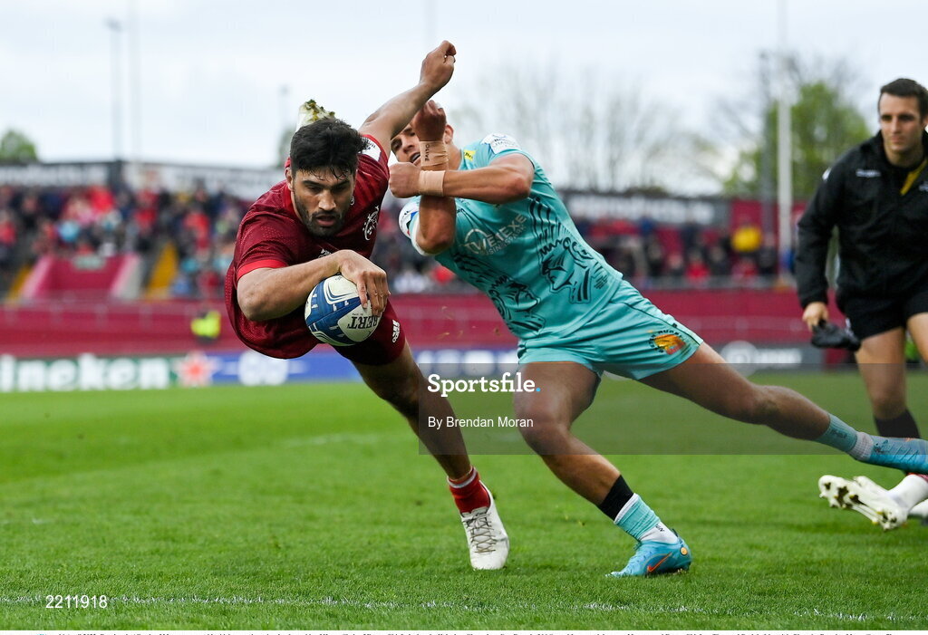 16 April 2022; Damian de Allende of Munster scores his side's second try despite the tackle of Henry Slade of Exeter Chiefs during the Heineken Champions Cup Round of 16 Second Leg match between Munster and Exeter Chiefs at Thomond Park in Limerick. Photo by Brendan Moran/Sportsfile
