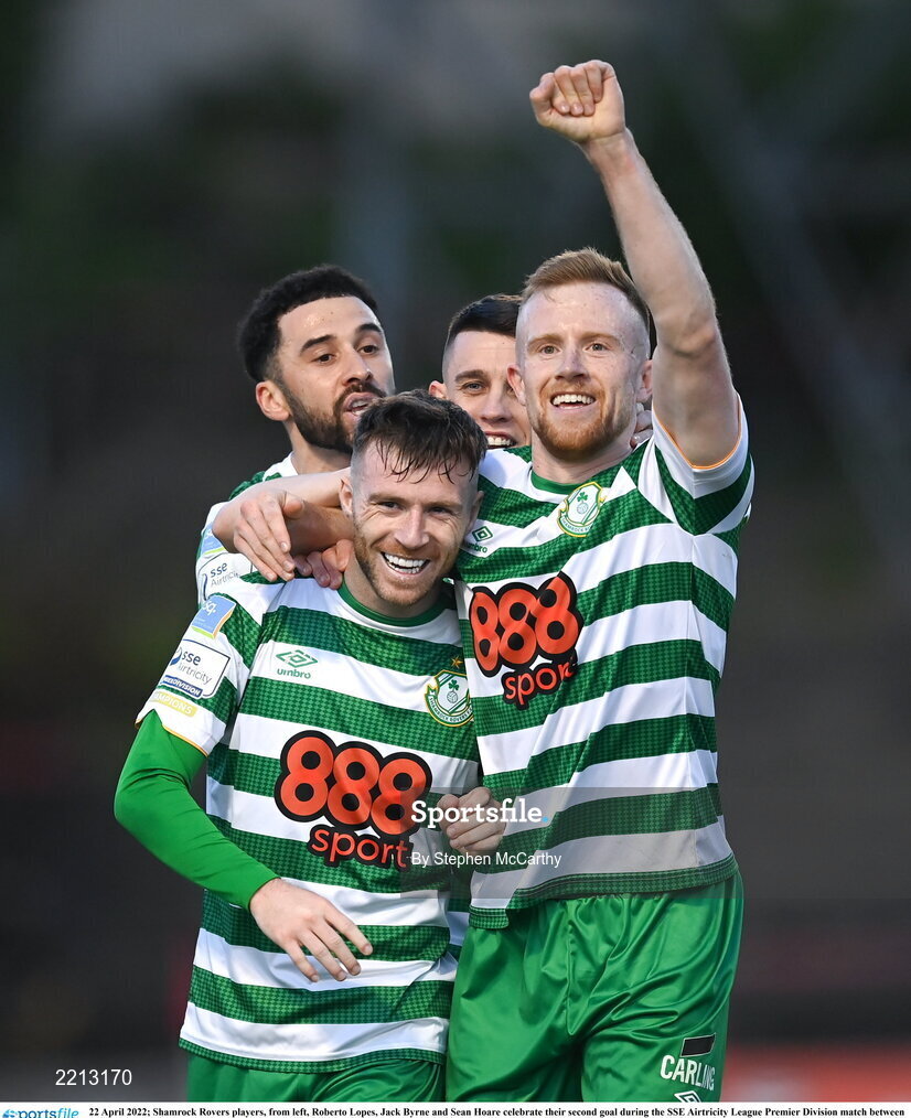 22 April 2022; Shamrock Rovers players, from left, Roberto Lopes, Jack Byrne and Sean Hoare celebrate their second goal during the SSE Airtricity League Premier Division match between Bohemians and Shamrock Rovers at Dalymount Park in Dublin. Photo by Stephen McCarthy/Sportsfile
