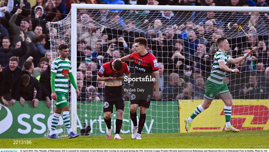 22 April 2022; Max Murphy of Bohemians, left, is consoled by teammate Grant Horton after scoring an own goal during the SSE Airtricity League Premier Division match between Bohemians and Shamrock Rovers at Dalymount Park in Dublin. Photo by Seb Daly/Sportsfile
