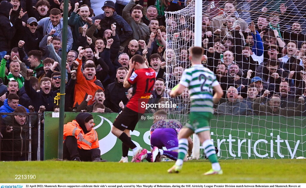 22 April 2022; Shamrock Rovers supporters celebrate their side's second goal, scored by Max Murphy of Bohemians, during the SSE Airtricity League Premier Division match between Bohemians and Shamrock Rovers at Dalymount Park in Dublin. Photo by Seb Daly/Sportsfile