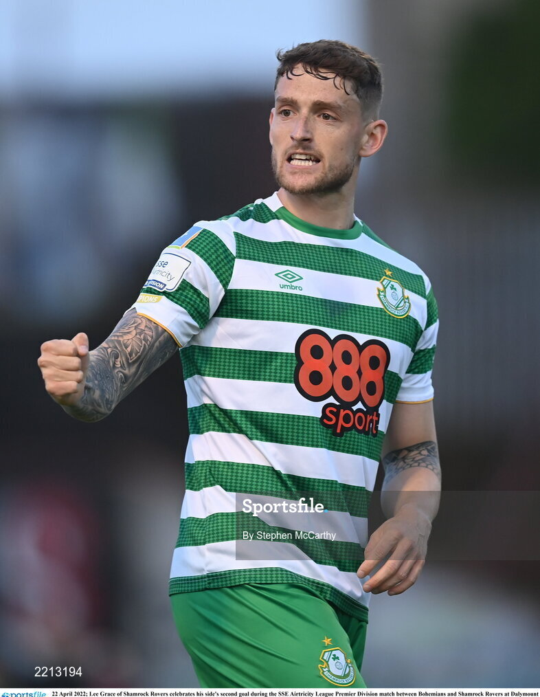 22 April 2022; Lee Grace of Shamrock Rovers celebrates his side's second goal during the SSE Airtricity League Premier Division match between Bohemians and Shamrock Rovers at Dalymount Park in Dublin. Photo by Stephen McCarthy/Sportsfile