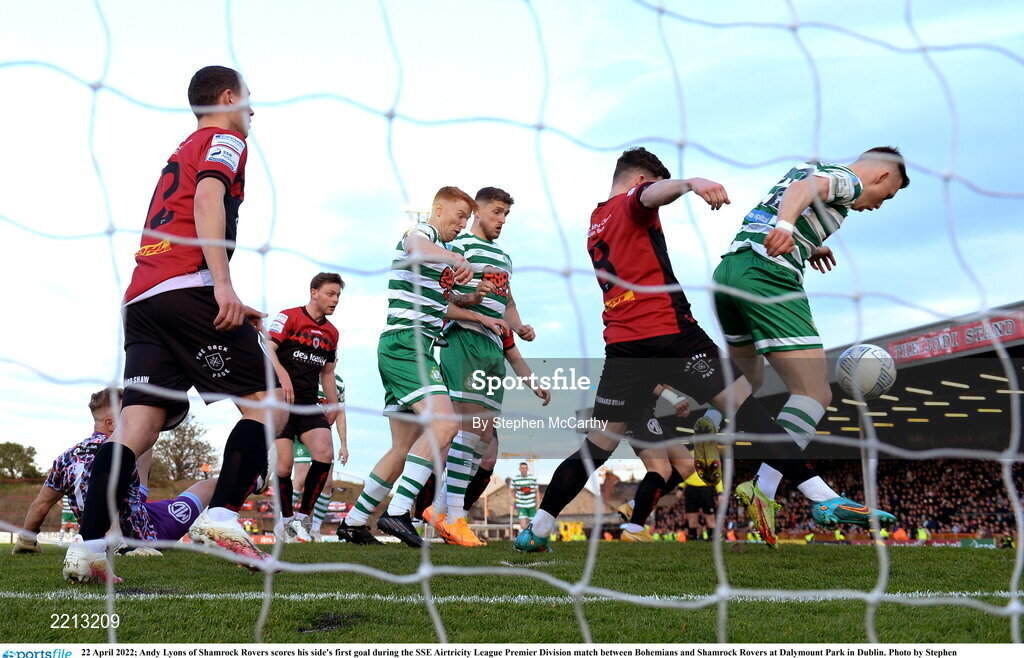 22 April 2022; Andy Lyons of Shamrock Rovers scores his side's first goal during the SSE Airtricity League Premier Division match between Bohemians and Shamrock Rovers at Dalymount Park in Dublin. Photo by Stephen McCarthy/Sportsfile