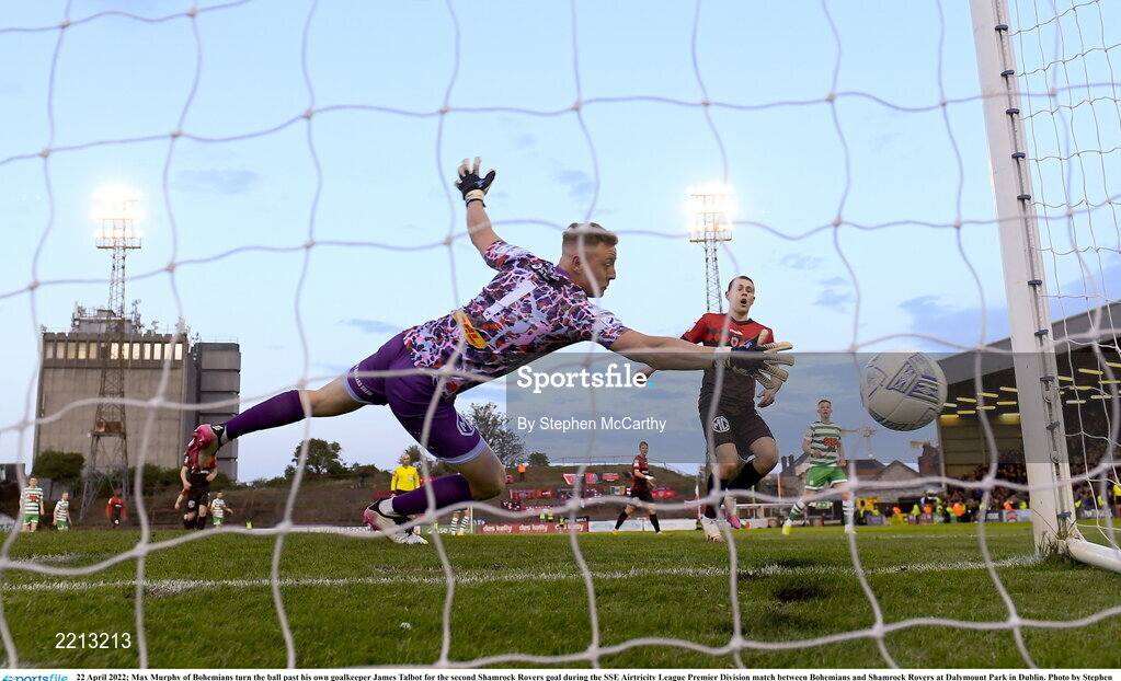 22 April 2022; Max Murphy of Bohemians turn the ball past his own goalkeeper James Talbot for the second Shamrock Rovers goal during the SSE Airtricity League Premier Division match between Bohemians and Shamrock Rovers at Dalymount Park in Dublin. Photo by Stephen McCarthy/Sportsfile