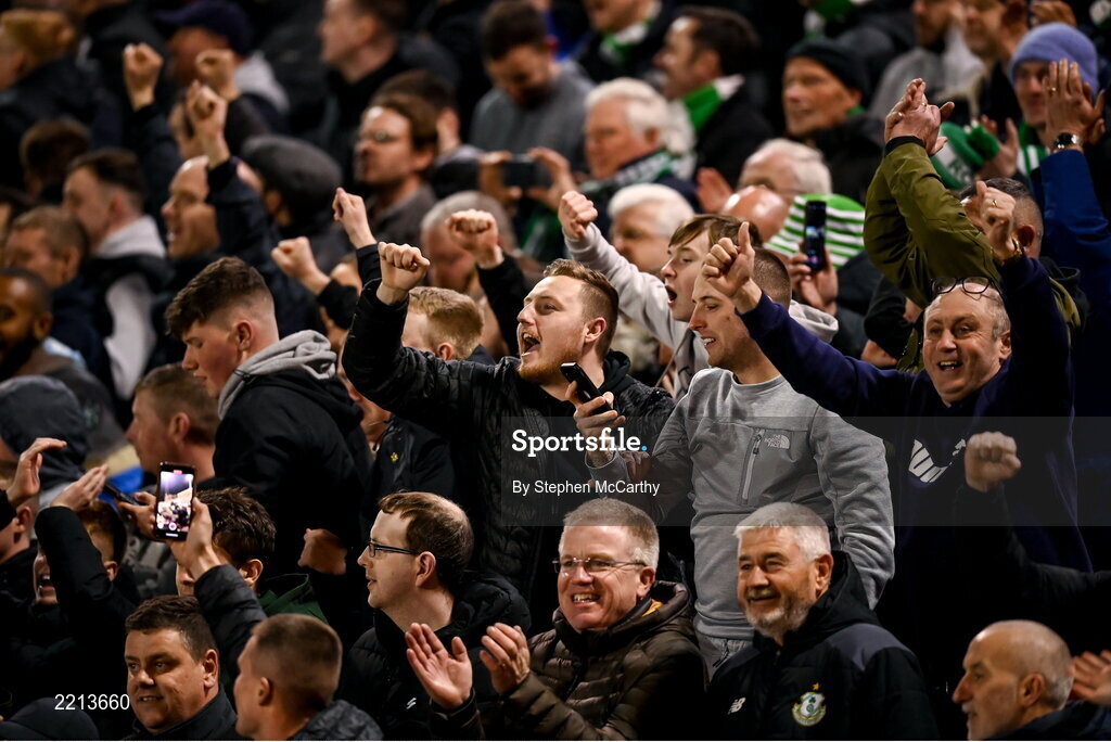 22 April 2022; Shamrock Rovers supporters celebrate after the SSE Airtricity League Premier Division match between Bohemians and Shamrock Rovers at Dalymount Park in Dublin. Photo by Stephen McCarthy/Sportsfile