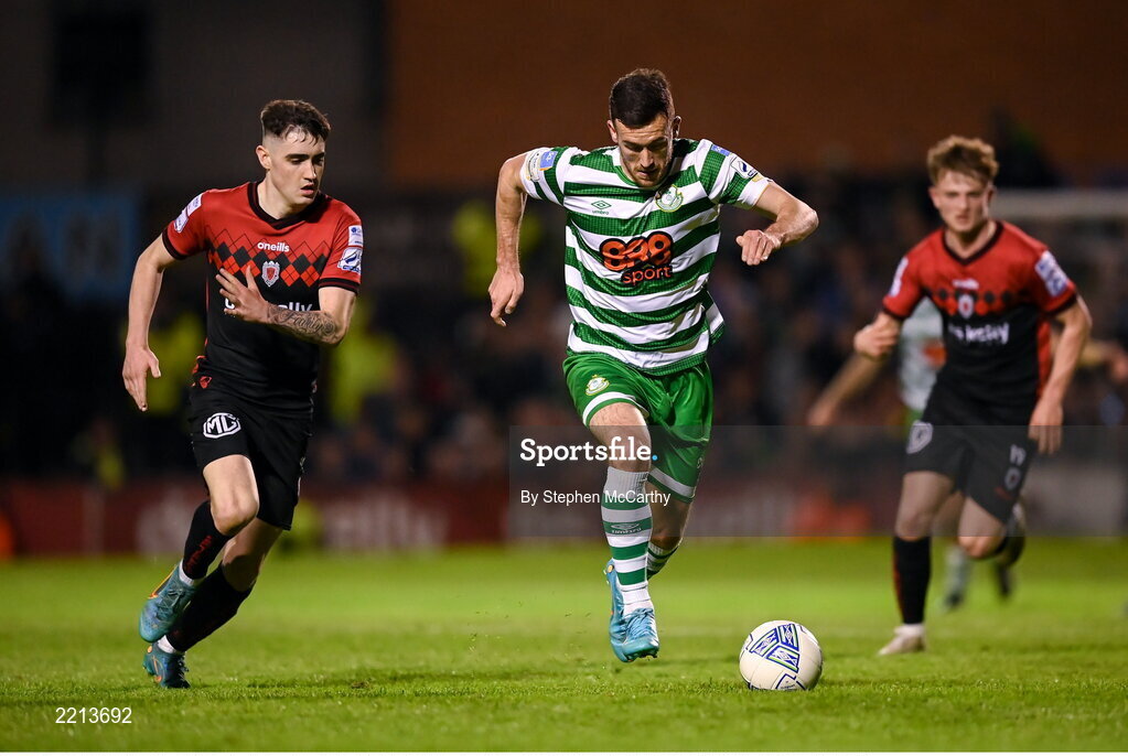 22 April 2022; Aaron Greene of Shamrock Rovers in action against Dawson Devoy of Bohemians during the SSE Airtricity League Premier Division match between Bohemians and Shamrock Rovers at Dalymount Park in Dublin. Photo by Stephen McCarthy/Sportsfile