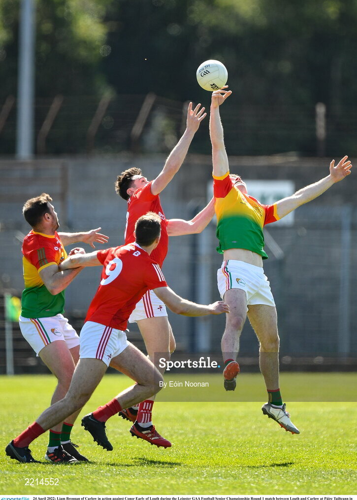 24 April 2022; Liam Brennan of Carlow in action against Conor Early of Louth during the Leinster GAA Football Senior Championship Round 1 match between Louth and Carlow at Páirc Tailteann in Navan, Meath. Photo by Eóin Noonan/Sportsfile