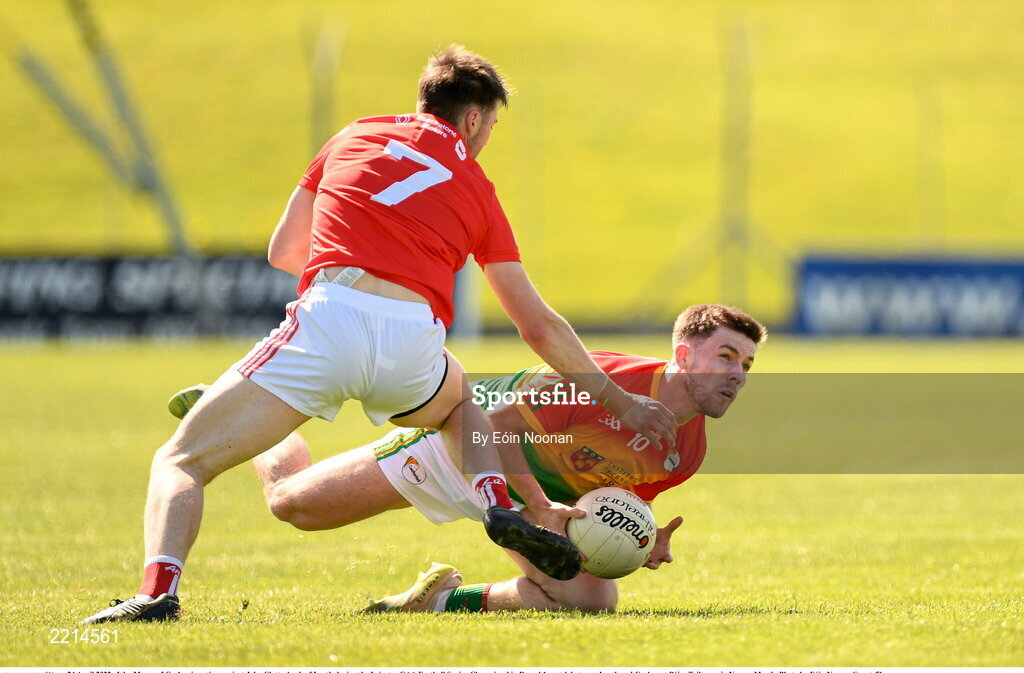 24 April 2022; John Moore of Carlow in action against John Clutterbuck of Louth during the Leinster GAA Football Senior Championship Round 1 match between Louth and Carlow at Páirc Tailteann in Navan, Meath. Photo by Eóin Noonan/Sportsfile