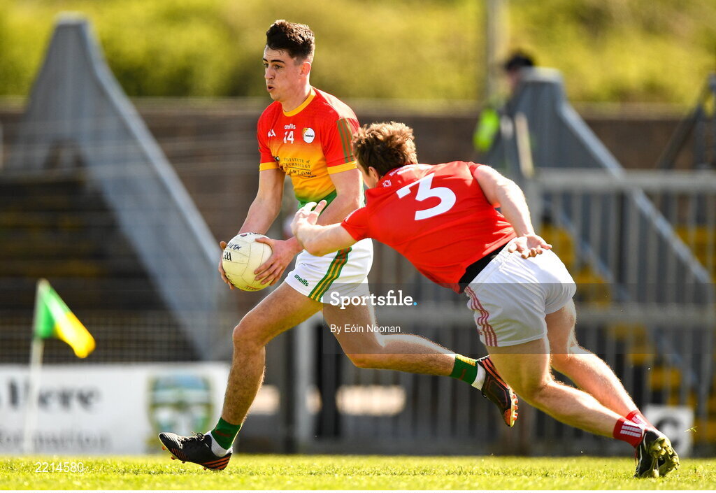 24 April 2022; Niall Hickey of Carlow in action against Bevan Duffy of Louth during the Leinster GAA Football Senior Championship Round 1 match between Louth and Carlow at Páirc Tailteann in Navan, Meath. Photo by Eóin Noonan/Sportsfile