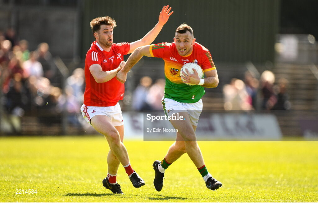 24 April 2022; Darragh Foley of Carlow in action against John Clutterbuck of Louth during the Leinster GAA Football Senior Championship Round 1 match between Louth and Carlow at Páirc Tailteann in Navan, Meath. Photo by Eóin Noonan/Sportsfile