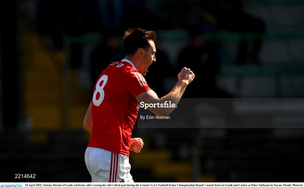 24 April 2022; Tommy Durnin of Louth celebrates after scoring his side's third goal during the Leinster GAA Football Senior Championship Round 1 match between Louth and Carlow at Páirc Tailteann in Navan, Meath. Photo by Eóin Noonan/Sportsfile