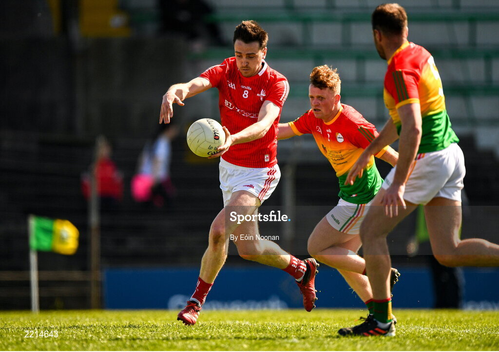 24 April 2022; Tommy Durnin of Louth shoots to score his side's third goal during the Leinster GAA Football Senior Championship Round 1 match between Louth and Carlow at Páirc Tailteann in Navan, Meath. Photo by Eóin Noonan/Sportsfile