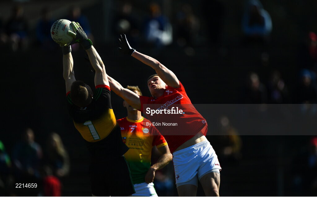 24 April 2022; Conal McKeever of Louth in action against Carlow goalkeeper Ciarán Cunningham during the Leinster GAA Football Senior Championship Round 1 match between Louth and Carlow at Páirc Tailteann in Navan, Meath. Photo by Eóin Noonan/Sportsfile