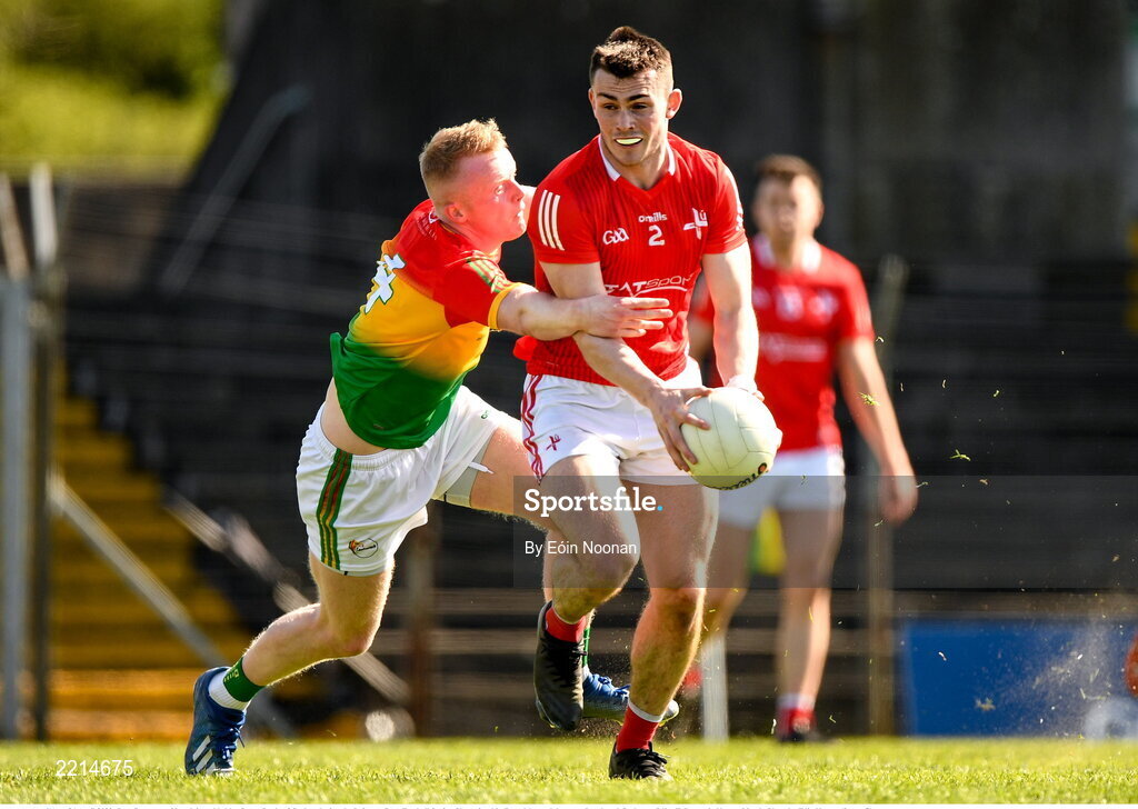 24 April 2022; Dan Corcoran of Louth is tackled by Conor Doyle of Carlow during the Leinster GAA Football Senior Championship Round 1 match between Louth and Carlow at Páirc Tailteann in Navan, Meath. Photo by Eóin Noonan/Sportsfile