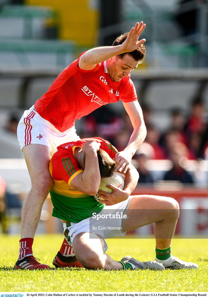 24 April 2022; Colm Hulton of Carlow is tackled by Tommy Durnin of Louth during the Leinster GAA Football Senior Championship Round 1 match between Louth and Carlow at Páirc Tailteann in Navan, Meath. Photo by Eóin Noonan/Sportsfile