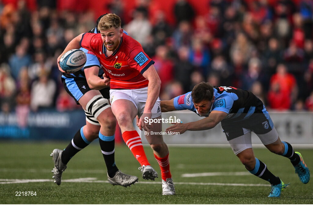 29 April 2022; Ben Healy of Munster is tackled by Jarrod Evans of Cardiff Blues during the United Rugby Championship match between Munster and Cardiff at Musgrave Park in Cork. Photo by Brendan Moran/Sportsfile