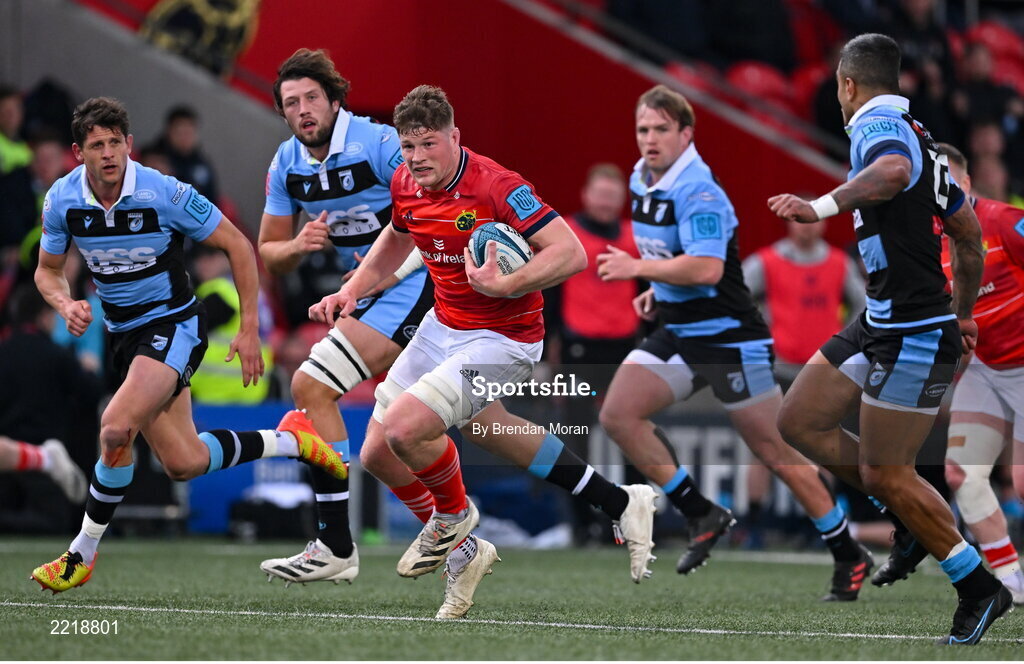 29 April 2022; Jack O'Donoghue of Munster makes a break during the United Rugby Championship match between Munster and Cardiff at Musgrave Park in Cork. Photo by Brendan Moran/Sportsfile