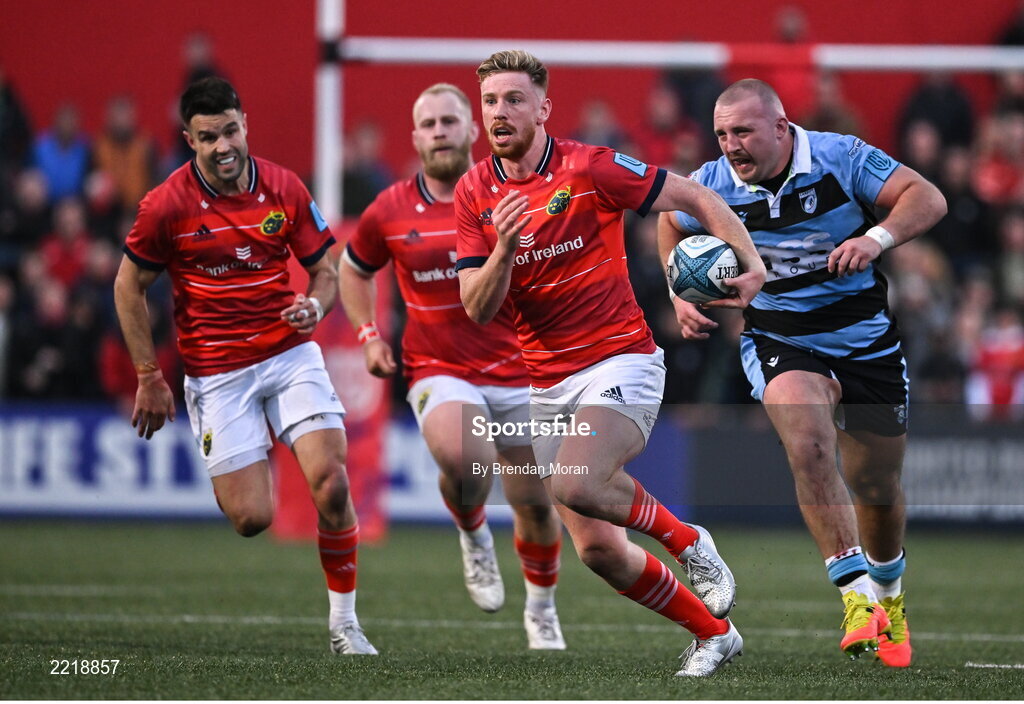 29 April 2022; Ben Healy of Munster makes a break during the United Rugby Championship match between Munster and Cardiff at Musgrave Park in Cork. Photo by Brendan Moran/Sportsfile