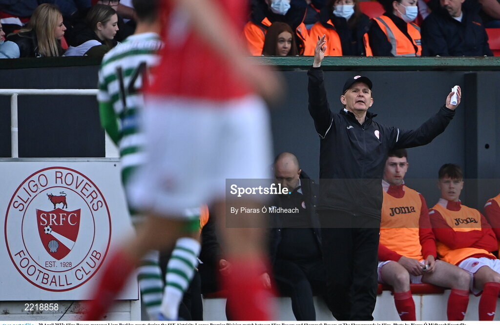 29 April 2022; Sligo Rovers manager Liam Buckley reacts during the SSE Airtricity League Premier Division match between Sligo Rovers and Shamrock Rovers at The Showgrounds in Sligo. Photo by Piaras Ó Mídheach/Sportsfile