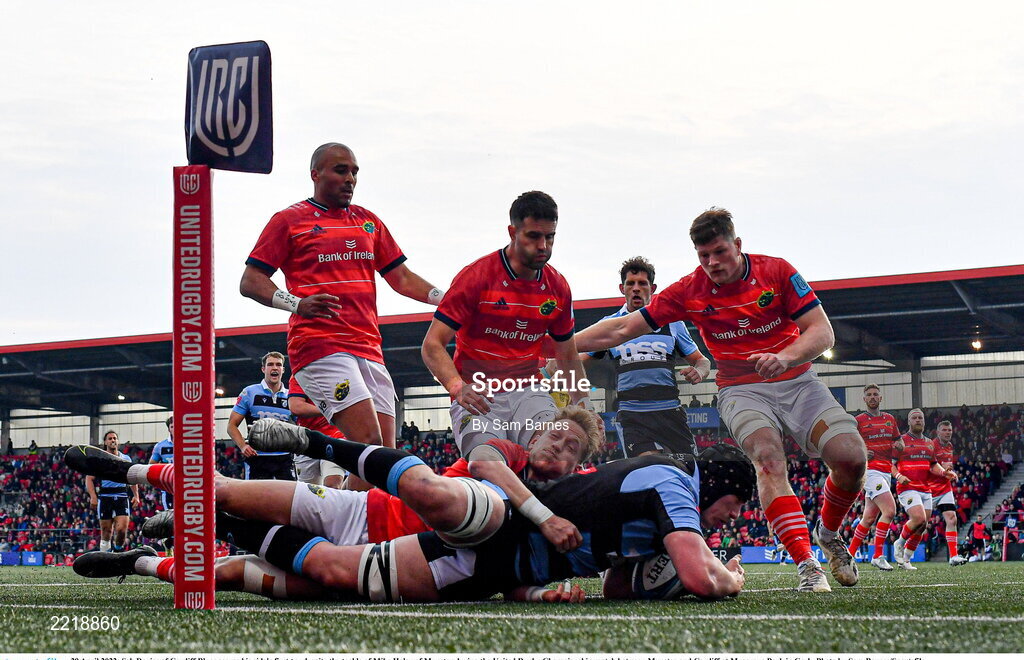 29 April 2022; Seb Davies of Cardiff Blues scores his side's first try despite the tackle of Mike Haley of Munster during the United Rugby Championship match between Munster and Cardiff at Musgrave Park in Cork. Photo by Sam Barnes/Sportsfile
