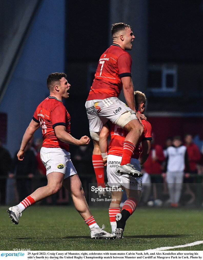 29 April 2022; Craig Casey of Munster, right, celebrates with team-mates Calvin Nash, left, and Alex Kendellen after scoring his side's fourth try during the United Rugby Championship match between Munster and Cardiff at Musgrave Park in Cork. Photo by Sam Barnes/Sportsfile