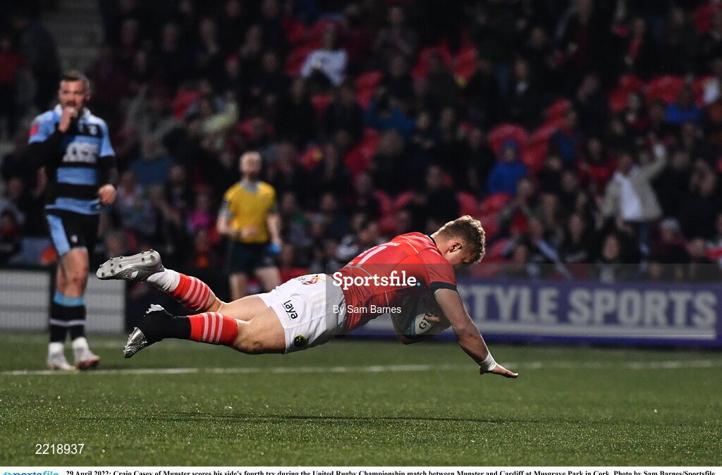 29 April 2022; Craig Casey of Munster scores his side's fourth try during the United Rugby Championship match between Munster and Cardiff at Musgrave Park in Cork. Photo by Sam Barnes/Sportsfile
