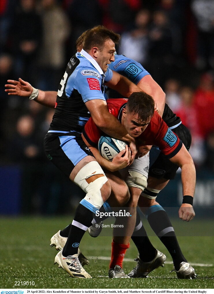 29 April 2022; Alex Kendellen of Munster is tackled by Garyn Smith, left, and Matthew Screech of Cardiff Blues during the United Rugby Championship match between Munster and Cardiff at Musgrave Park in Cork. Photo by Sam Barnes/Sportsfile