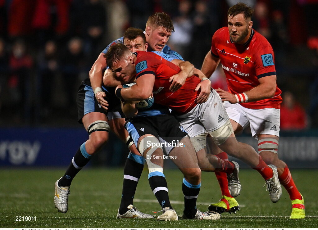 29 April 2022; Alex Kendellen of Munster is tackled by Garyn Smith, left, and Matthew Screech of Cardiff Blues during the United Rugby Championship match between Munster and Cardiff at Musgrave Park in Cork. Photo by Sam Barnes/Sportsfile