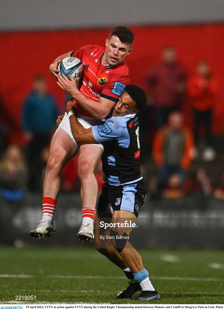 29 April 2022; Calvin Nash of Munster is tackled by Theo Cabango of Cardiff Blues during the United Rugby Championship match between Munster and Cardiff at Musgrave Park in Cork. Photo by Sam Barnes/Sportsfile