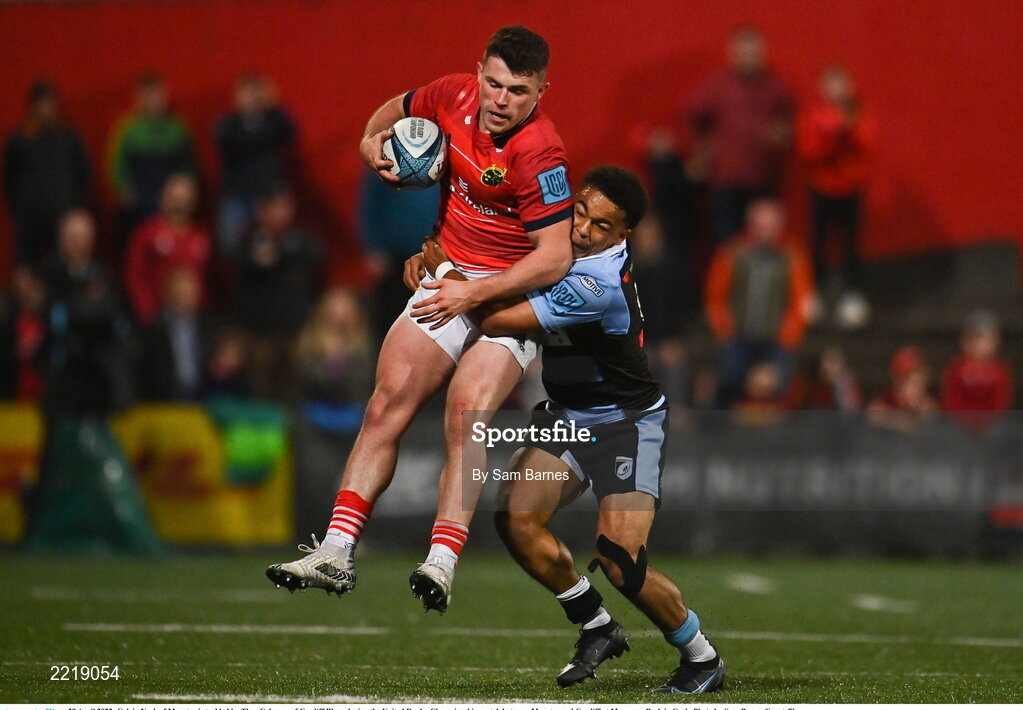 29 April 2022; Calvin Nash of Munster is tackled by Theo Cabango of Cardiff Blues during the United Rugby Championship match between Munster and Cardiff at Musgrave Park in Cork. Photo by Sam Barnes/Sportsfile