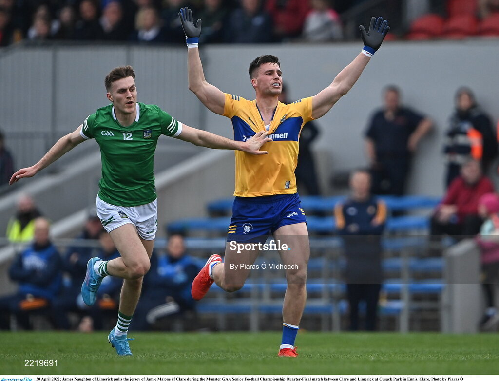 30 April 2022; James Naughton of Limerick pulls the jersey of Jamie Malone of Clare during the Munster GAA Senior Football Championship Quarter-Final match between Clare and Limerick at Cusack Park in Ennis, Clare. Photo by Piaras Ó Mídheach/Sportsfile