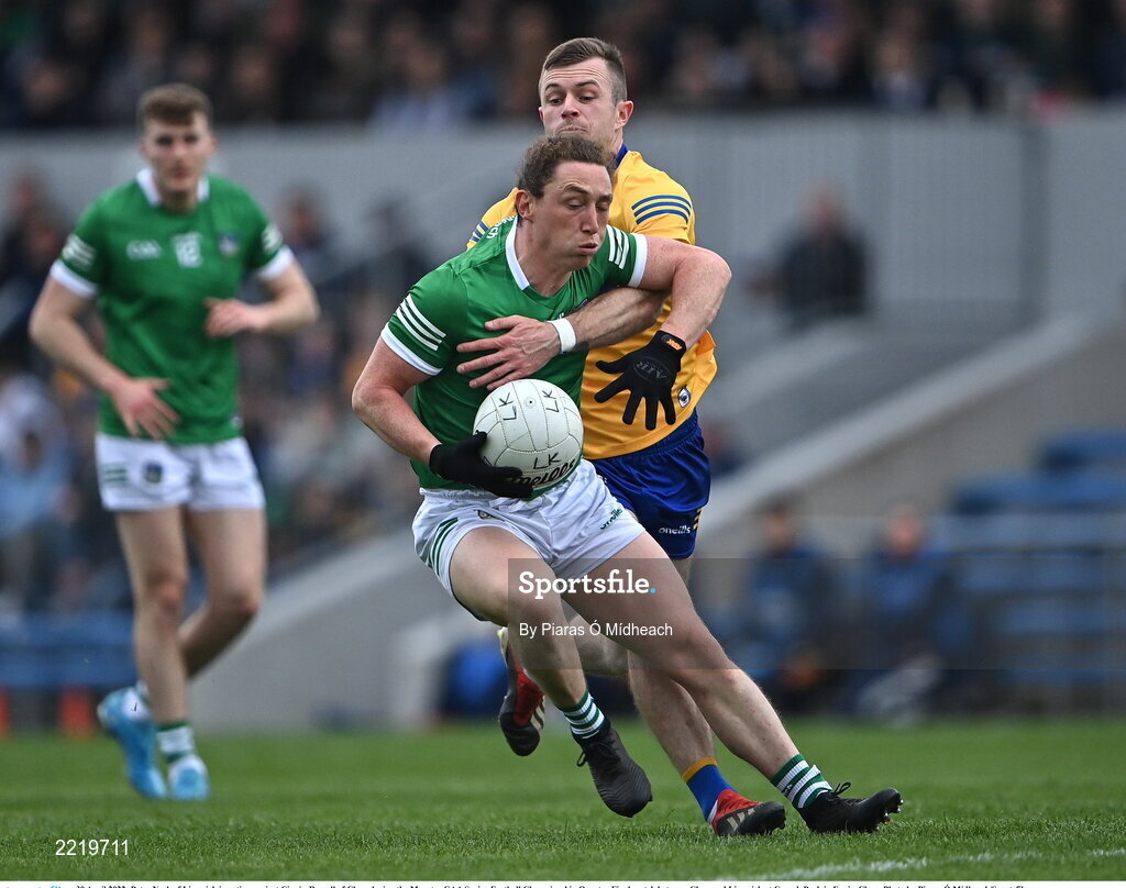 30 April 2022; Peter Nash of Limerick in action against Ciarán Russell of Clare during the Munster GAA Senior Football Championship Quarter-Final match between Clare and Limerick at Cusack Park in Ennis, Clare. Photo by Piaras Ó Mídheach/Sportsfile