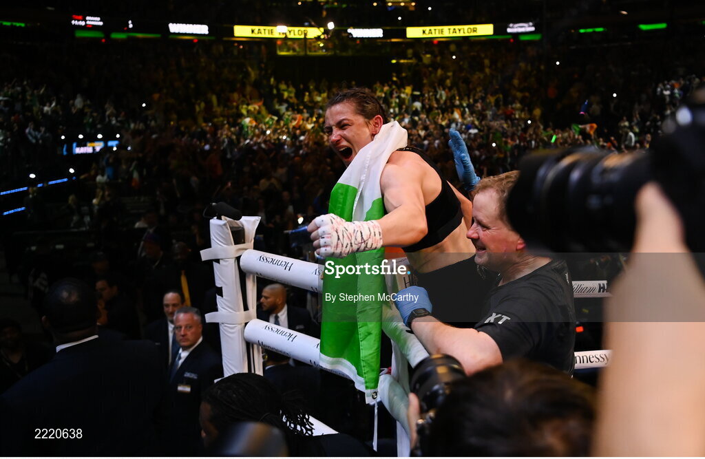 30 April 2022; Katie Taylor celebrates victory after her undisputed world lightweight championship fight with Amanda Serrano at Madison Square Garden in New York, USA. Photo by Stephen McCarthy/Sportsfile
