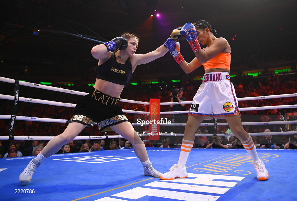 30 April 2022; Katie Taylor, left, and Amanda Serrano during their undisputed world lightweight championship fight at Madison Square Garden in New York, USA. Photo by Stephen McCarthy/Sportsfile