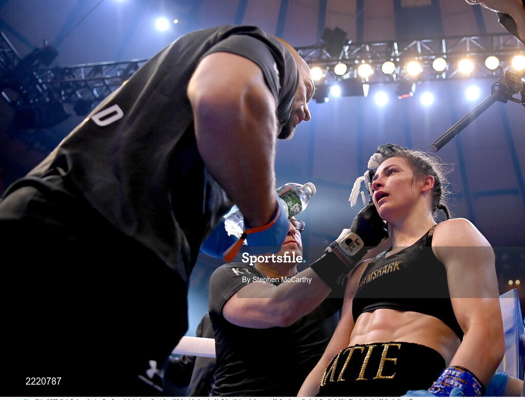 30 April 2022; Katie Taylor and trainer Ross Enamait during her undisputed world lightweight championship fight with Amanda Serrano at Madison Square Garden in New York, USA. Photo by Stephen McCarthy/Sportsfile