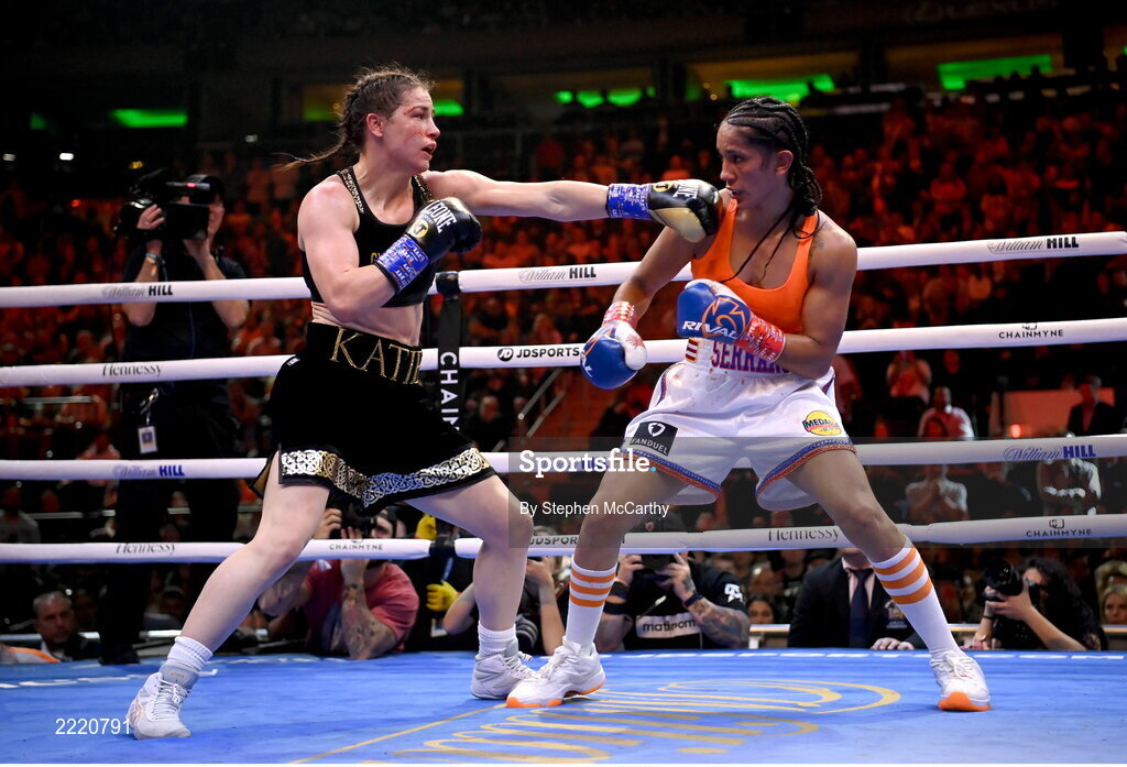 30 April 2022; Katie Taylor, left, and Amanda Serrano during their undisputed world lightweight championship fight at Madison Square Garden in New York, USA. Photo by Stephen McCarthy/Sportsfile