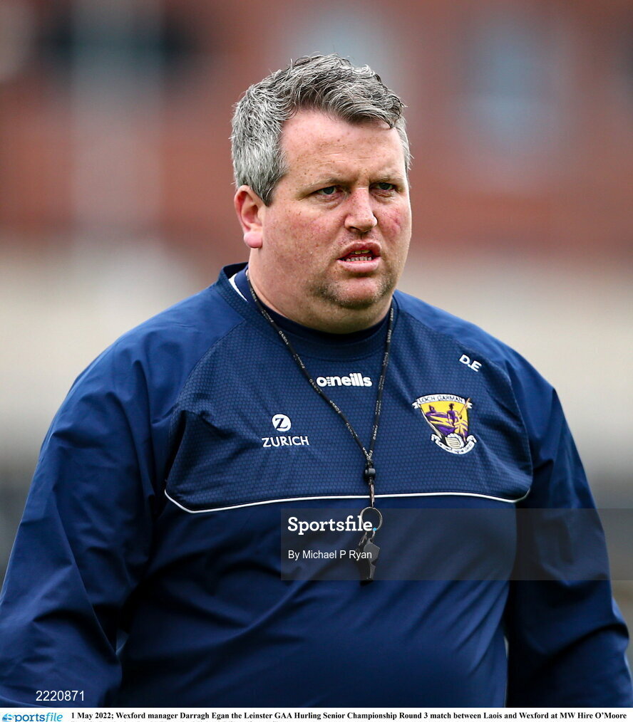 1 May 2022; Wexford manager Darragh Egan the Leinster GAA Hurling Senior Championship Round 3 match between Laois and Wexford at MW Hire O’Moore Park in Portlaoise, Laois. Photo by Michael P Ryan/Sportsfile