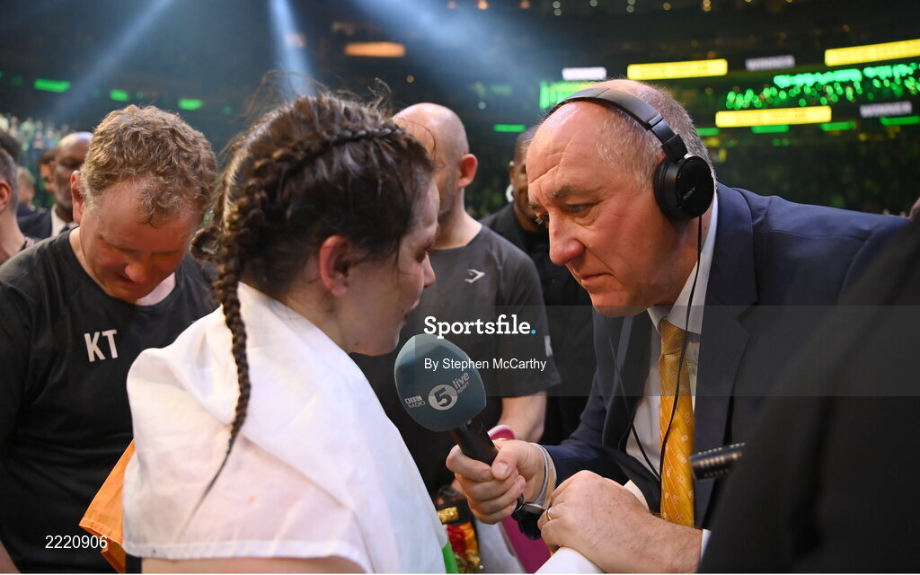 30 April 2022; Katie Taylor is interviewed by BBC's Steve Bunce following her undisputed world lightweight championship fight victory over Amanda Serrano at Madison Square Garden in New York, USA. Photo by Stephen McCarthy/Sportsfile
