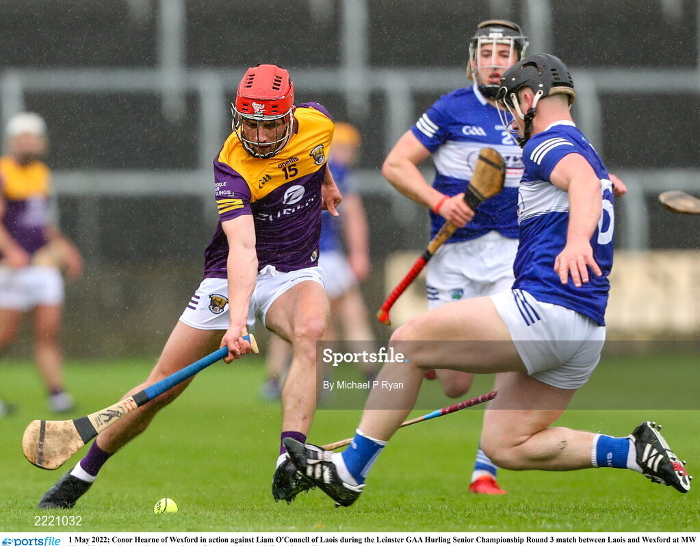 1 May 2022; Conor Hearne of Wexford in action against Liam O'Connell of Laois during the Leinster GAA Hurling Senior Championship Round 3 match between Laois and Wexford at MW Hire O’Moore Park in Portlaoise, Laois. Photo by Michael P Ryan/Sportsfile