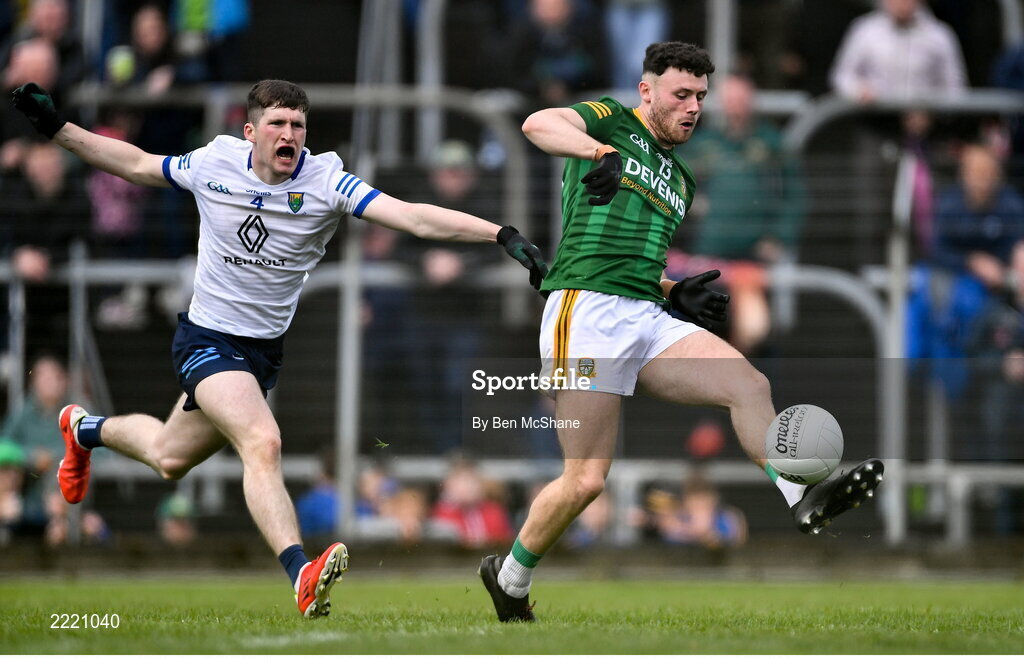 1 May 2022; Jordan Morris of Meath scores a point despite the attention of Tom Moran of Wicklow during the Leinster GAA Football Senior Championship Quarter-Final match between Meath and Wicklow at Páirc Tailteann in Navan, Meath. Photo by Ben McShane/Sportsfile