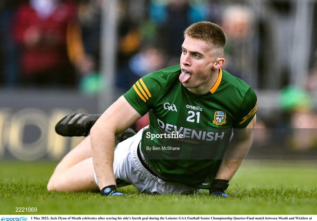 1 May 2022; Jack Flynn of Meath celebrates after scoring his side's fourth goal during the Leinster GAA Football Senior Championship Quarter-Final match between Meath and Wicklow at Páirc Tailteann in Navan, Meath. Photo by Ben McShane/Sportsfile