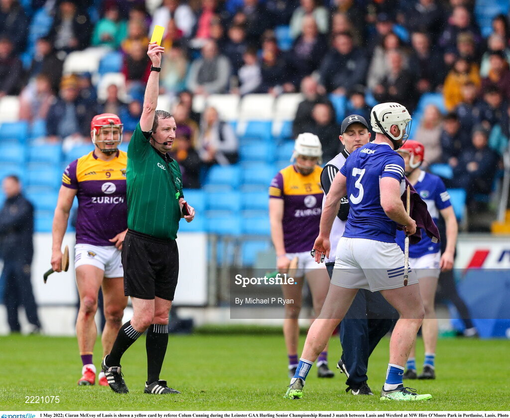1 May 2022; Ciaran McEvoy of Laois is shown a yellow card by referee Colum Cunning during the Leinster GAA Hurling Senior Championship Round 3 match between Laois and Wexford at MW Hire O’Moore Park in Portlaoise, Laois. Photo by Michael P Ryan/Sportsfile