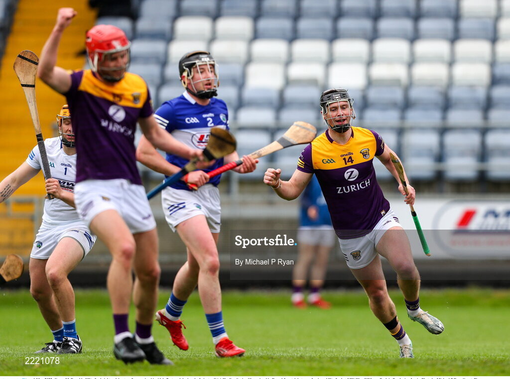 1 May 2022; Conor McDonald of Wexford right, celebrates after scoring his side's first goal during the Leinster GAA Hurling Senior Championship Round 3 match between Laois and Wexford at MW Hire O’Moore Park in Portlaoise, Laois. Photo by Michael P Ryan/Sportsfile
