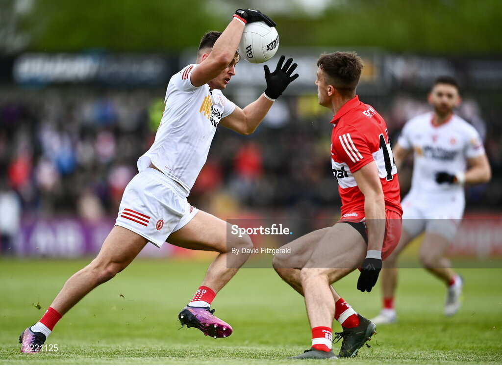 1 May 2022; Michael McKernan of Tyrone in action against Shane McGuigan of Derry during the Ulster GAA Football Senior Championship Quarter-Final match between Tyrone and Derry at O'Neills Healy Park in Omagh, Tyrone. Photo by David Fitzgerald/Sportsfile