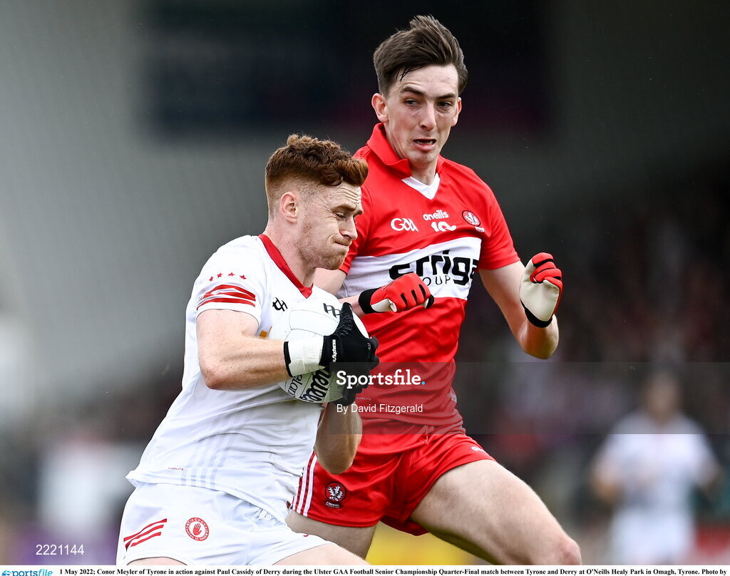 1 May 2022; Conor Meyler of Tyrone in action against Paul Cassidy of Derry during the Ulster GAA Football Senior Championship Quarter-Final match between Tyrone and Derry at O'Neills Healy Park in Omagh, Tyrone. Photo by David Fitzgerald/Sportsfile